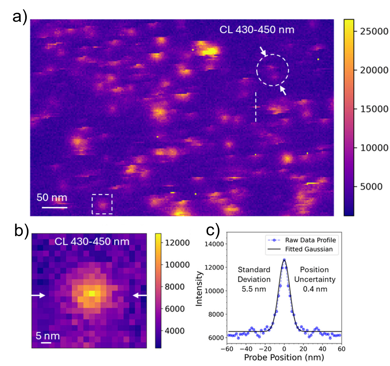 To investigate the origin of this localized blue emission, an overview CL hyperspectral map of a folded hBN flake was acquired to identify the location of individual emitters. Figure 1a shows such a map where CL intensity is integrated over the 430-450nm wavelength range, and in which both clusters and single point emitters can be observed. Figure 1b shows a higher-magnification CL map of one single-point emitter, as indicated by the dashed white box in the overview map. The emission profile appears to be highly localized and Gaussian in nature. Figure 1c shows an intensity profile cut along the center of another, similar single-point emitter, along with a corresponding Gaussian fit. Notably, the Gaussian profile has a standard deviation of 5.5 nm, a measure of the highly localized nature of the emission. A position uncertainty of only 0.4 nm also demonstrates that, for such emitters, CL benefits fully from the excellent spatial resolution of the STEM probe and that CL spectra can be correlated to other spatially-mapped properties with a high degree of confidence.