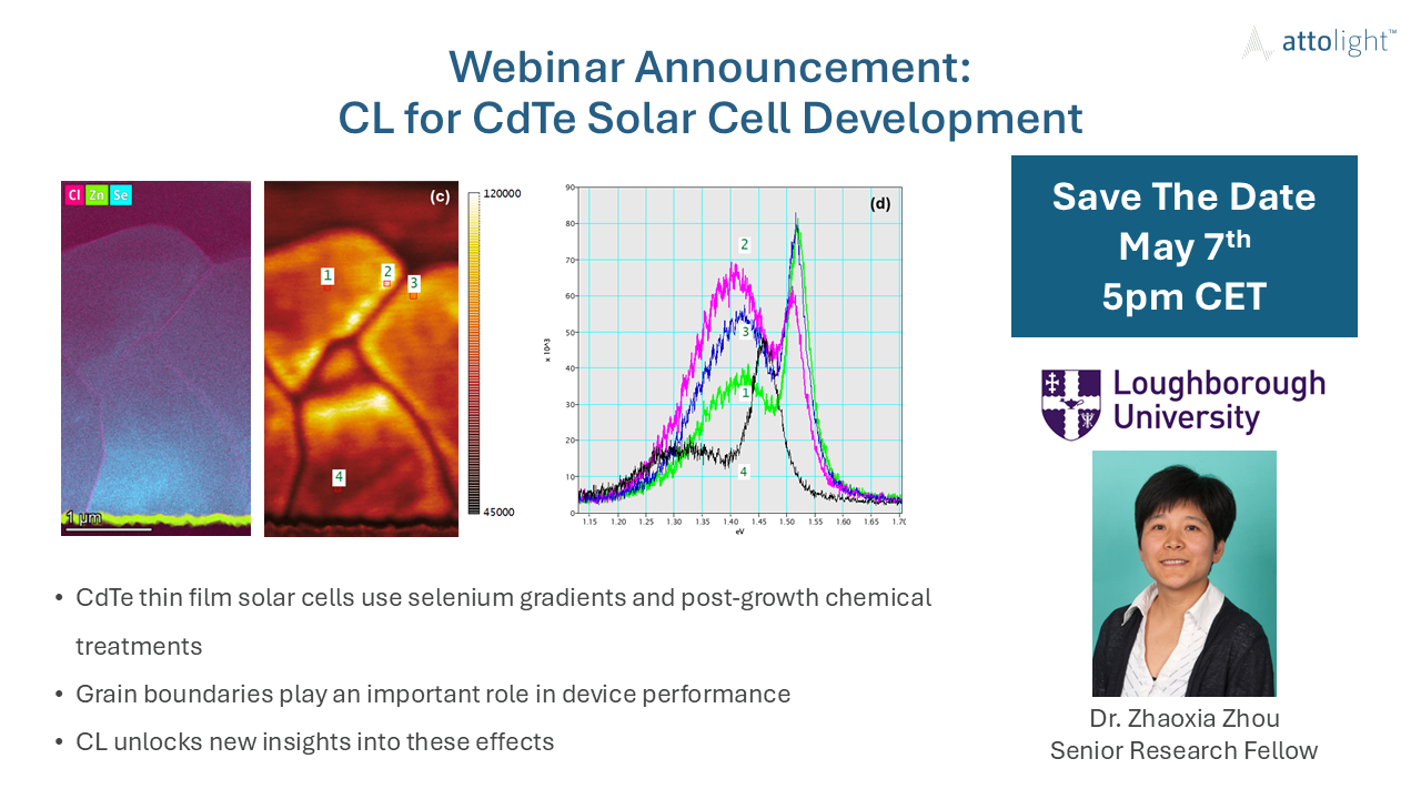 The webinar will focus on the application of STEM/CL to investigate Se-alloyed CdTe thin-film solar cells—one of the leading commercial photovoltaic technologies. By integrating CL with established STEM techniques, including high-angle annular dark-field (HAADF) imaging and energy-dispersive X-ray spectroscopy (EDS), Dr. Zhou will demonstrate how correlative, multimodal analysis supports a deeper understanding of CdTe-based devices and contributes to improved process optimisation.