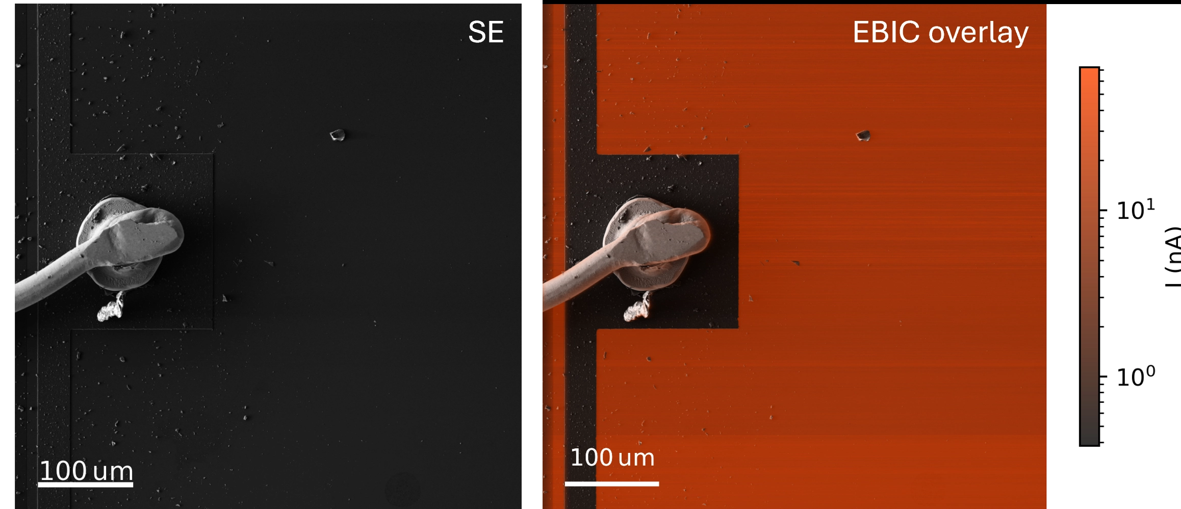 After signal collection, the electrical current is usually amplified using a transimpedance amplifier. The amplification system in itself presents trade-offs between bandwidth, gain, linearity, and input noise. This means that EBIC/EBAC acquisitions usually aren’t as quick as typical SE/BSE acquisitions. They are, however, quantitative and allow measurement of important semiconductor properties such as minority carrier mobility[1].