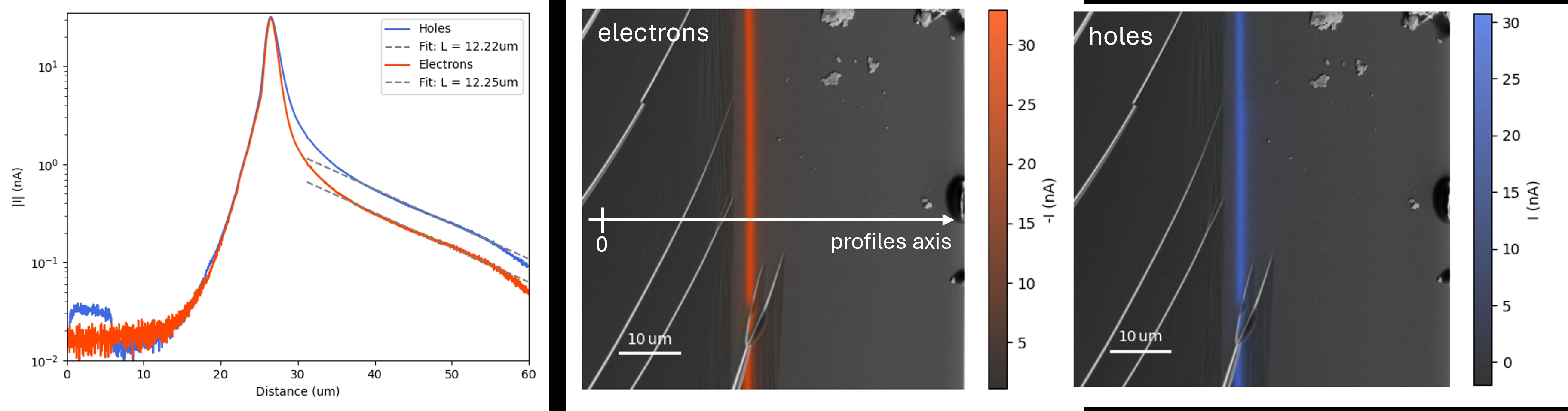 Figure 5 Cross section view of a Silicon p-n junction, highlighting the electron (middle) and holes (right contrast), together with their average profile (left). Minority carrier mean free path can be deduced from fitting the profile across the junction as shown in the profiles